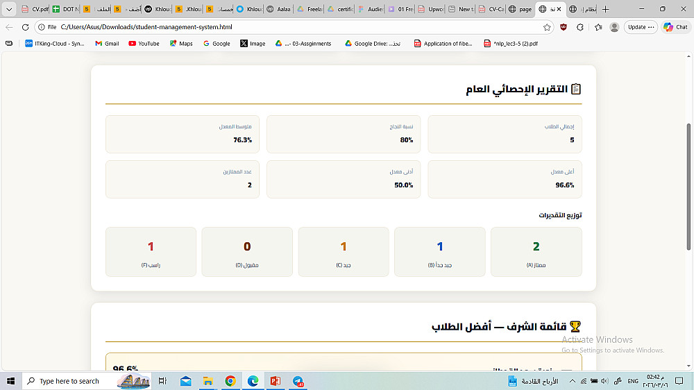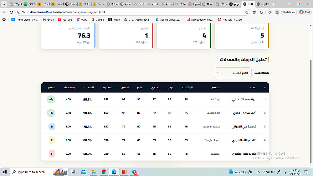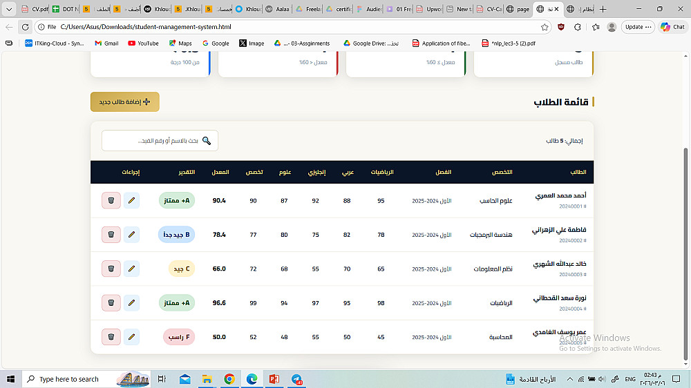 سأقدم لك نظام إدارة طلاب متكامل يعمل مباشرة في المتصفح بدون أي تثبيت أو سيرفر،