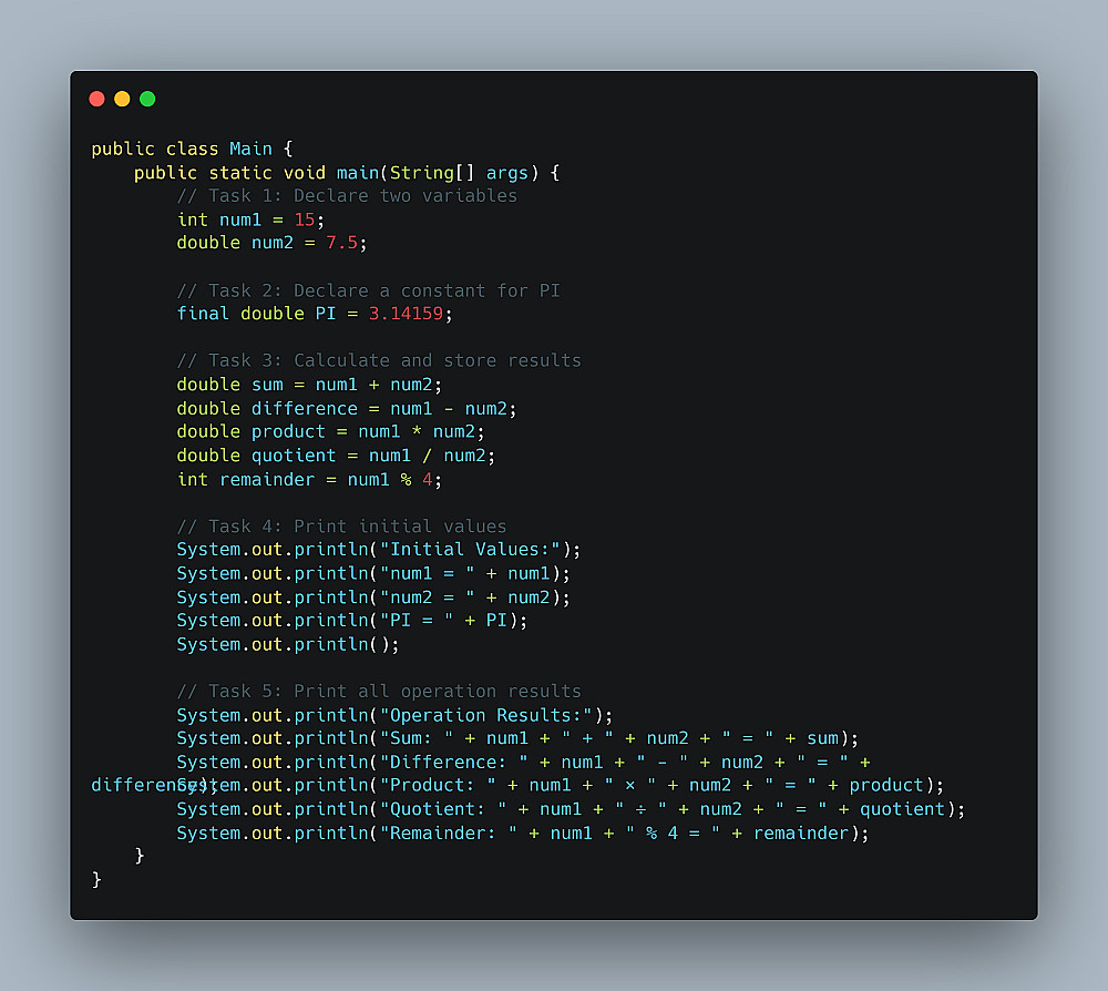 تصميم برنامج بلغة Java يوضح كيفية التعامل مع المتغيرات والثوابت وإجراء العمليات الحسابية.