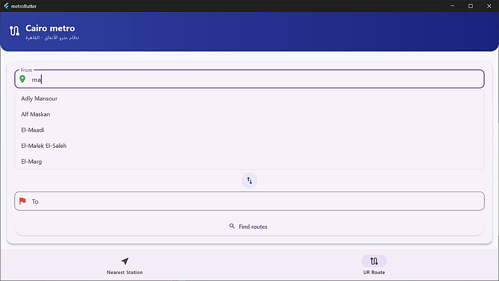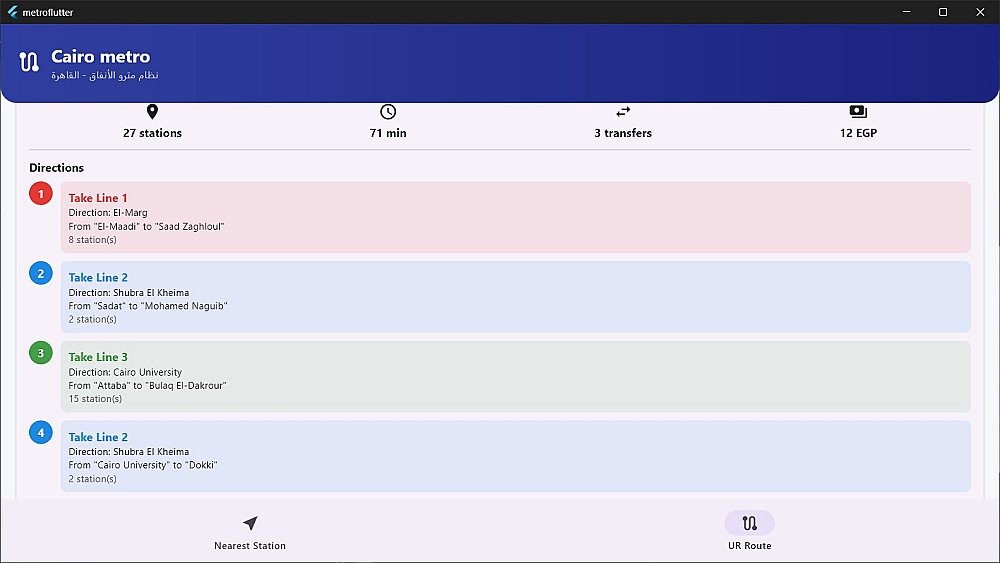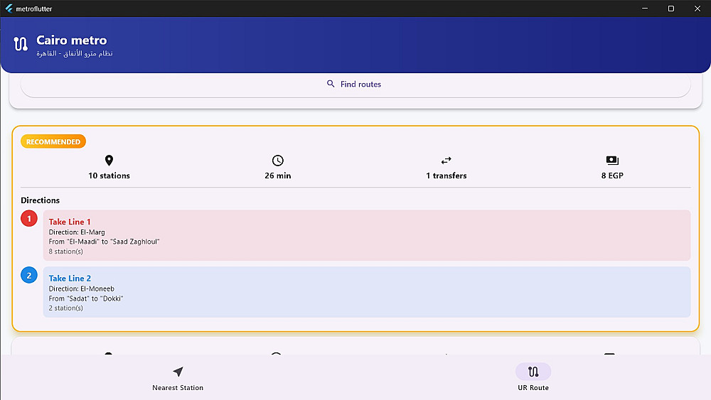 ويعرض البرنامج تفاصيل الرحلة بشكل واضح، مثل خط السير محطة بمحطة، والمحطات التحويلية بين الخطوط، مما يساعد المستخدم على التنقل داخل المترو بسهولة وبدون ارتباك.