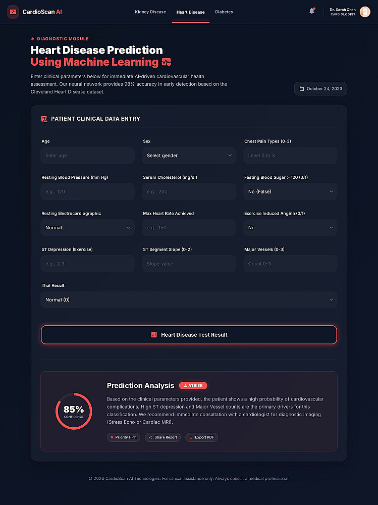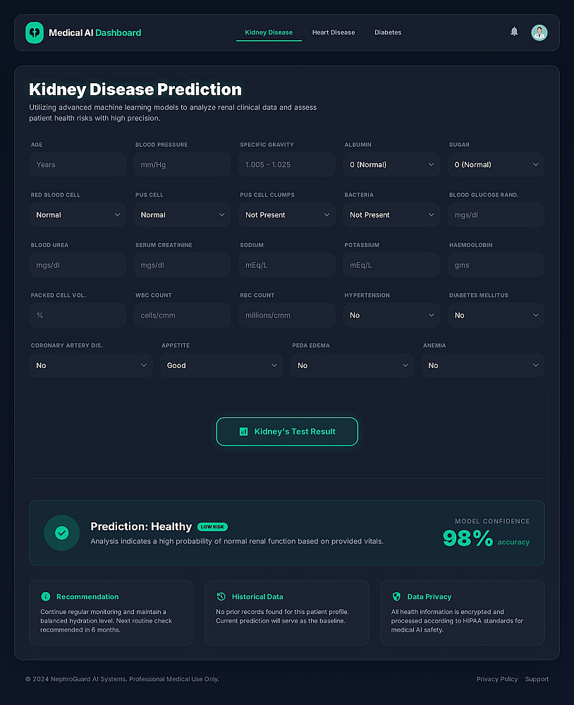 أقدم لك نظام ذكاء اصطناعي طبي يمكنه التنبؤ باحتمالية الإصابة بثلاثة أمراض شائعة: **السكري، أمراض القلب، وأمراض الكلى المزمنة** اعتمادًا على بيانات المريض مثل نتائج التحاليل والعلامات الحيوية. يقوم النظام بتحليل القيم الطبية المدخلة باستخدام نماذج **Machine Learning** مدربة على بيانات طبية حقيقية، ثم يعرض النتيجة بشكل فوري مع **نسبة الاحتمالية (Probability Score)** ومستوى الخطورة **(منخفض – متوسط – مرتفع)** بالإضافة إلى **توصيات طبية مبدئية باللغة العربية** تساعد على فهم الحالة بشكل أفضل. الخدمة عبارة عن **نظام ويب كامل** يمكن استخدامه بسهولة من خلال واجهة بسيطة لإدخال بيانات المريض، وبعدها يتم إرسال البيانات إلى نموذج الذكاء الاصطناعي الذي يقوم بتحليلها وإرجاع تقرير واضح يحتوي على: * نتيجة التنبؤ بالمرض * نسبة الثقة في التنبؤ * مستوى الخطورة * توصيات صحية بناءً على القيم المدخلة كما يتم توفير النظام بشكل قابل للربط مع أي موقع أو تطبيق من خلال **API**، مما يجعله مناسبًا للمشاريع الصحية، التطبيقات الطبية، أو أنظمة دعم القرار الطبي. هذه الخدمة مناسبة للمطورين، الباحثين، أو أصحاب المشاريع الصحية الذين يريدون دمج **الذكاء الاصطناعي في المجال الطبي** لإنشاء أدوات تساعد في التقييم المبدئي للحالات الطبية وتحليل البيانات الصحية بسرعة ودقة.