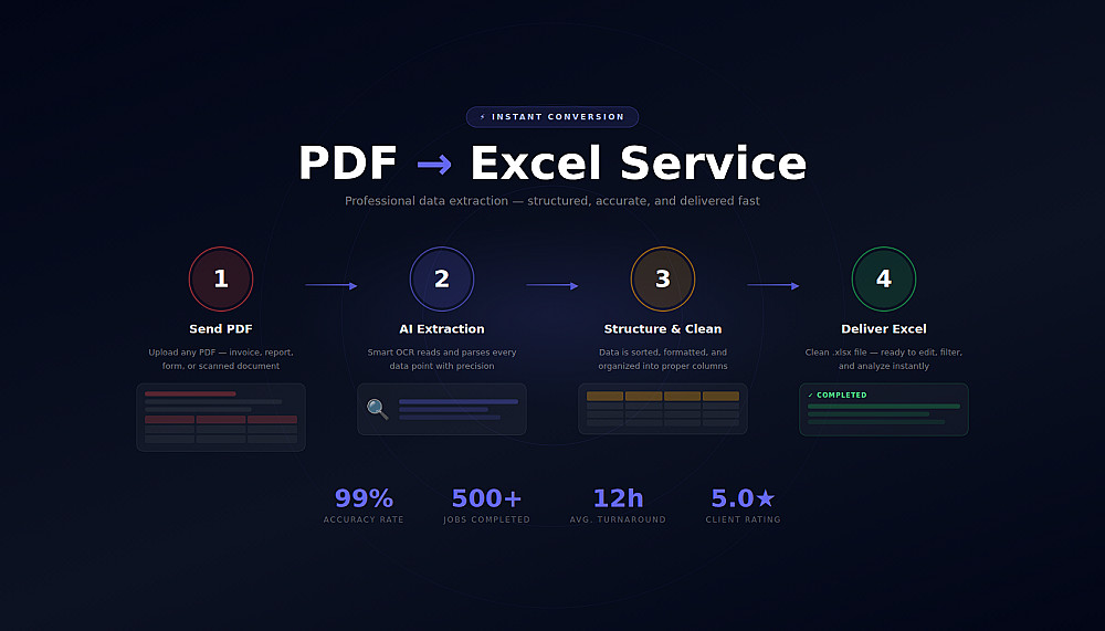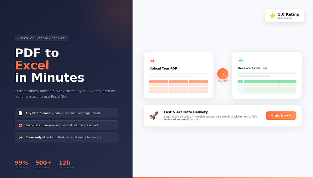 أقدم خدمة تحويل الجداول والبيانات من ملفات PDF إلى Excel بدقة عالية مع الحفاظ على ترتيب البيانات والتنسيق الصحيح.