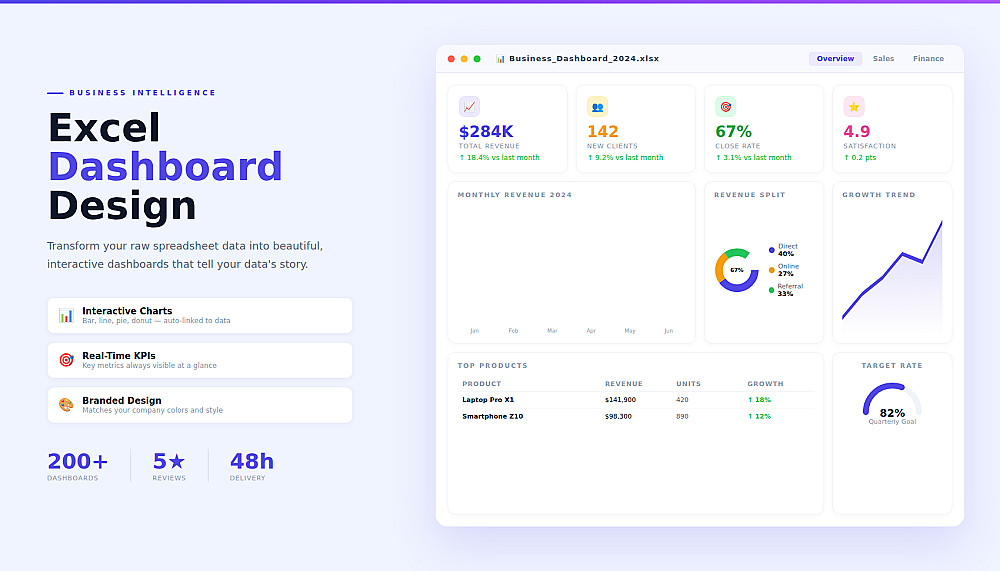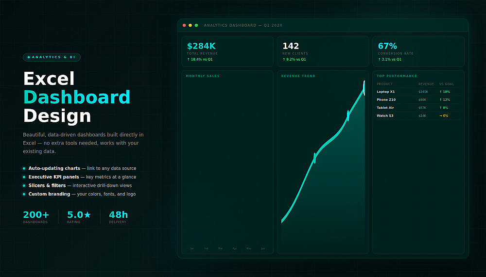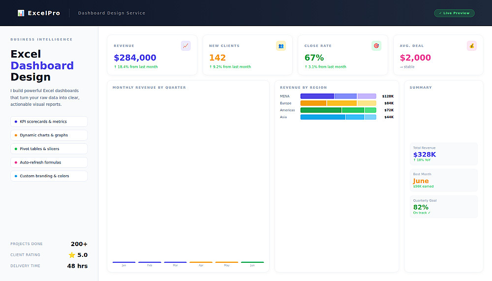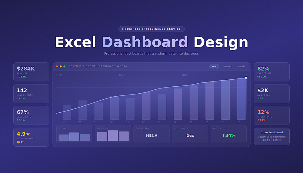 أقوم بتصميم لوحات تحكم احترافية في Excel تساعد على تحليل البيانات وعرض النتائج باستخدام الرسوم البيانية.