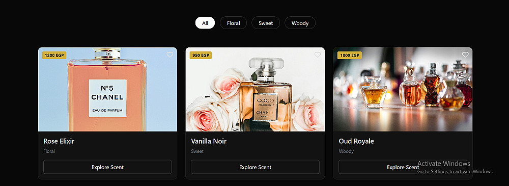 يتيح الموقع عرض مجموعة من العطور مع إمكانية تصفية المنتجات حسب نوع الرائحة مثل (Floral – Sweet – Woody)، بالإضافة إلى عرض تفاصيل كل عطر في نافذة منبثقة عند الضغط على زر "Explore Scent".