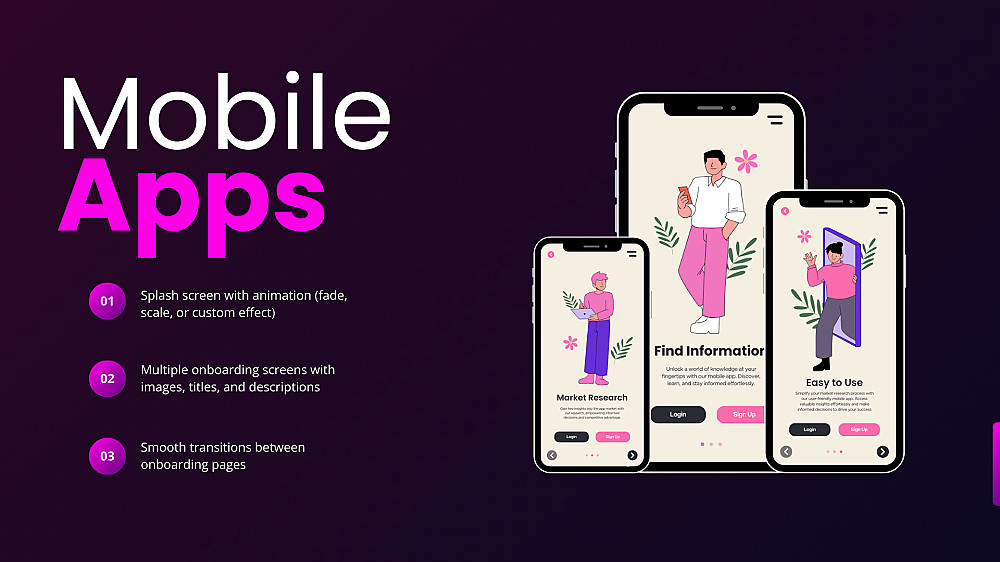 شاشات Onboarding متعددة مع صور وعناوين ووصف لكل شاشة