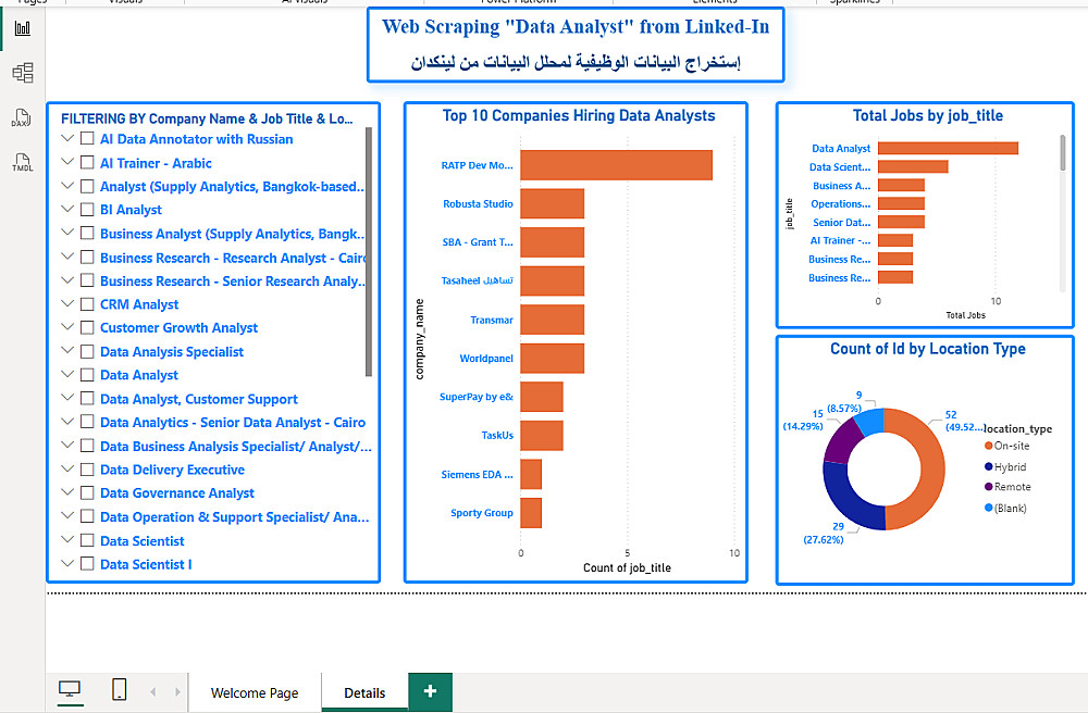 أقدم لك خدمة احترافية لاستخراج وتحليل بيانات الوظائف الخاصة بـ محلل البيانات (Data Analyst) من منصة LinkedIn باستخدام أدوات تحليل البيانات الحديثة.