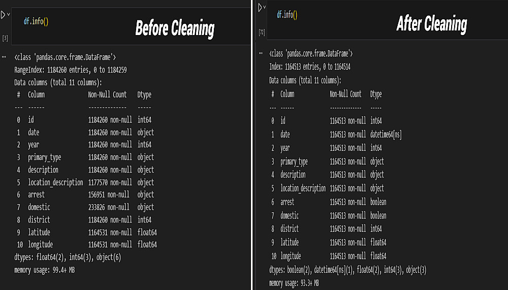 - تنظيف البيانات (Data Cleaning): التعامل مع القيم المفقودة (Null values) سواء بالحذف أو التعويض (Imputation) ، وتصحيح أنواع البيانات (Data Types) لضمان دقة المعالجة الحسابية والزمنية.