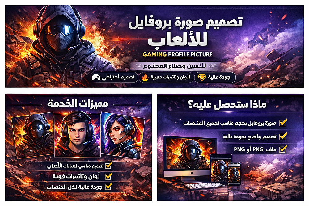 تصميم صورة بروفايل ألعاب احترافية بجودة عالية وتأثيرات مميزة 🎮🔥 إذا أحببت، أقدر أن أصنع لك 2–3 خيارات بديلة قصيرة