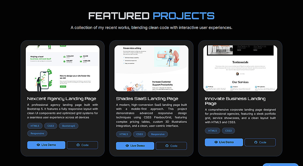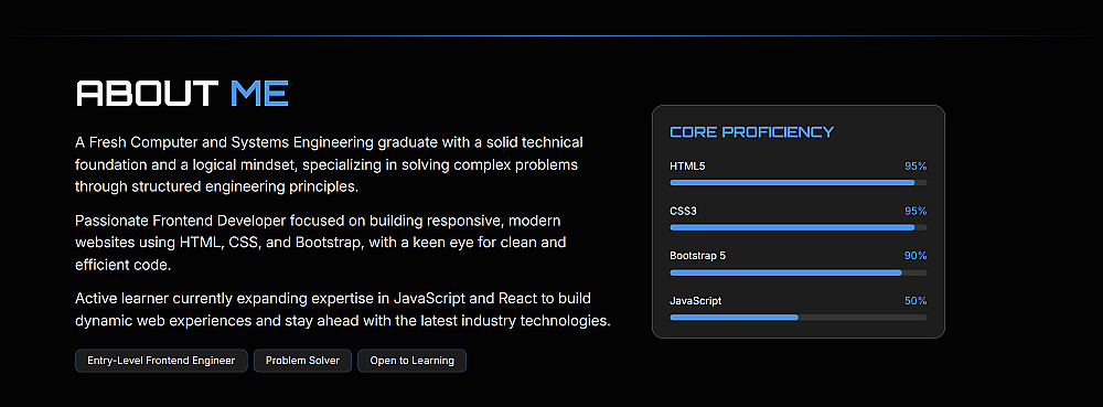 بناء موقع بورتفوليو (Single Page): تصميم يتكون من 4 أقسام احترافية أساسية (قسم الترحيب Hero، نبذة عني، المهارات والمشاريع، وقسم التواصل).