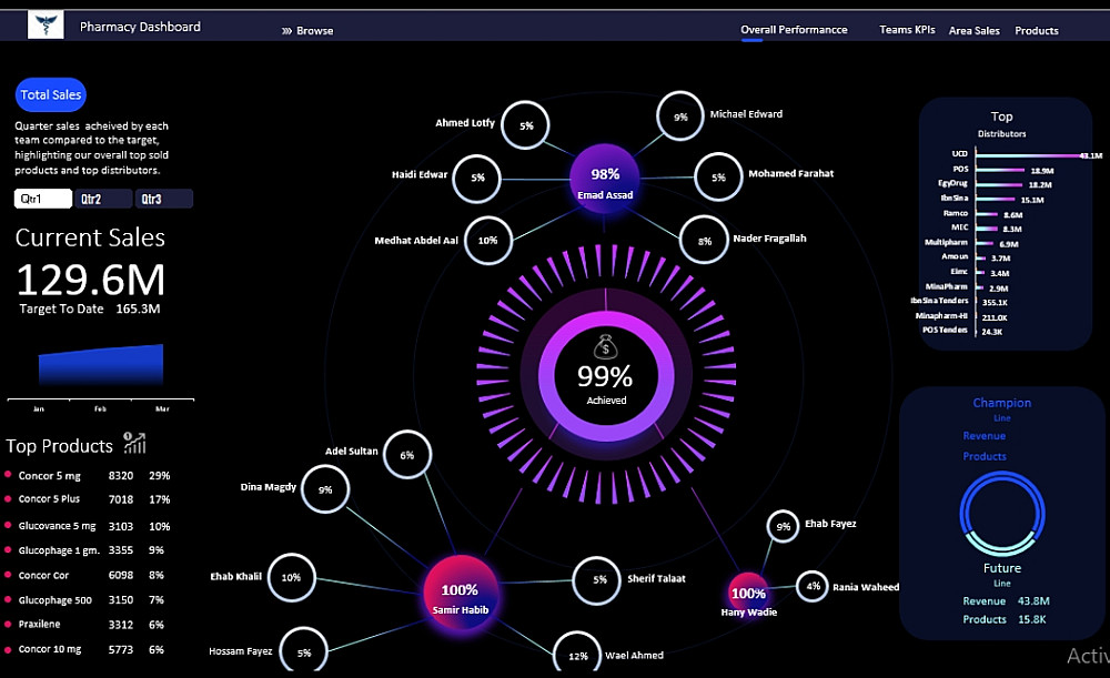 تحتوي الـ Dashboard على مجموعة من المؤشرات الرئيسية التي توضح أهم المعلومات الموجودة في البيانات مثل الإجماليات والنسب والتوزيعات المختلفة. كما تتضمن عناصر تفاعلية مثل Slicers لتمكين المستخدم من تصفية البيانات واستكشافها بسهولة حسب الفئات المختلفة.