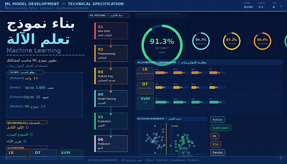 إذا كنت تحتاج إلى نموذج تعلم آلة يمكنه التنبؤ بالنتائج أو تصنيف البيانات، سأقوم بتطوير نموذج Machine Learning مناسب لمشكلتك باستخدام أفضل الخوارزميات.