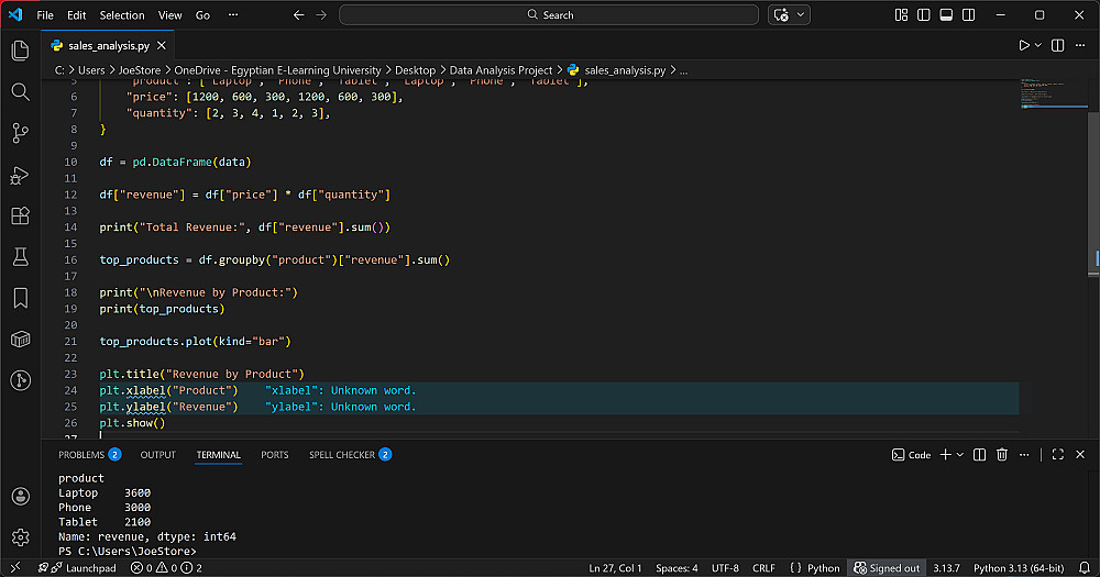 في هذا المشروع قمت بتحليل بيانات مبيعات بسيطة باستخدام لغة Python ومكتبة Pandas بهدف استخراج بعض المعلومات المهمة مثل إجمالي الأرباح وأداء المنتجات المختلفة. كما تم استخدام مكتبة Matplotlib لإنشاء رسم بياني يوضح الإيرادات الخاصة بكل منتج.