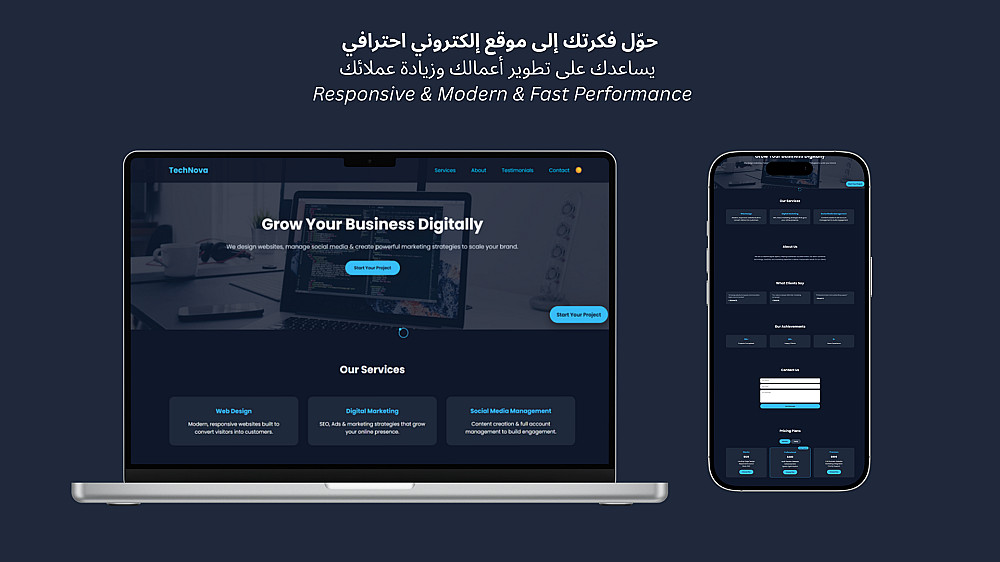 - متجاوب 100% (Responsive): سيبدو موقعك رائعاً سواء تصفحه العميل من الموبايل، التابلت، أو شاشة الكمبيوتر.