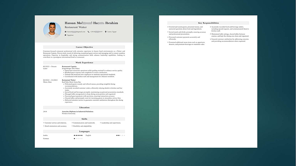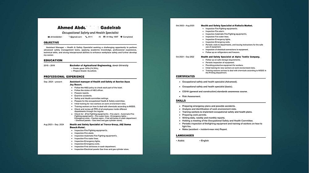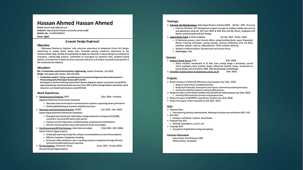 هل تريد سيرة ذاتية تفتح لك أبواب المقابلات الشخصية؟ السيرة الذاتية هي بوابتك الأولى للوظيفة، لذا أقدم لك خدمة تصميم وكتابة سيرتك الذاتية بأسلوب احترافي يجمع بين الجمال البصري والمعايير التقنية العالمية تضمن لك عبور أنظمة الفلترة الآلية والوصول إلى طاولة المقابلات الشخصية.