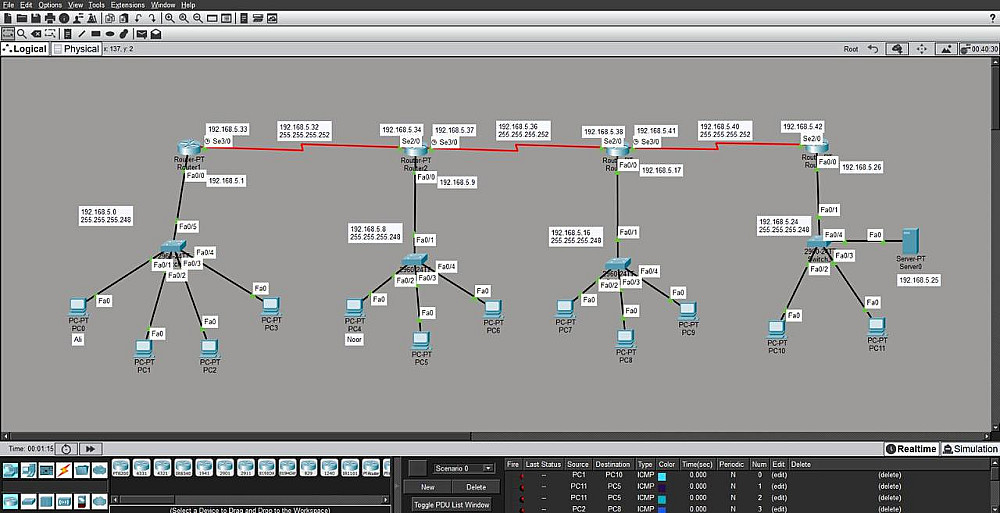 -بناء الهيكل (Topology): توزيع أجهزة الكمبيوتر، السيرفرات، الطابعات، وربطها باستخدام الـ Switches والـ Routers بشكل منظم.