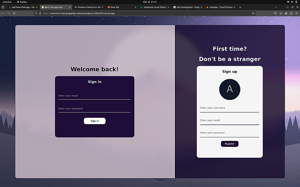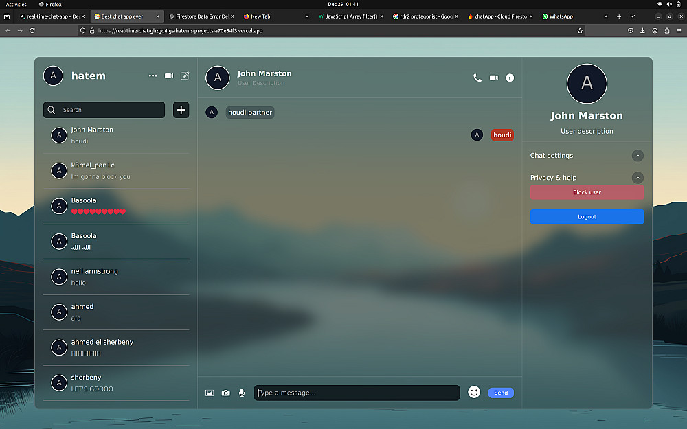 موقع للمحادثة بين اكثر من شخص في نفس الوقت تم تطويره بreact للفرونت وvit و firebase لقاعدة البيانات. هذا الموقع يتيحك ايضا حظر الاشخاص لتجنب المضايقات.