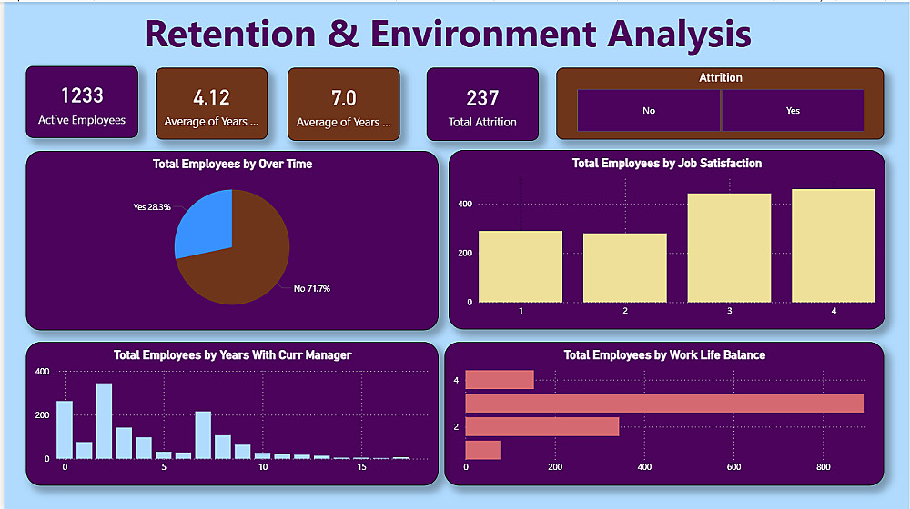 تحليل بيئة العمل والاحتفاظ بالموظفين (Retention & Environment): قياس مستويات الرضا الوظيفي، التوازن بين العمل والحياة، وتأثير العمل الإضافي على أداء الموظفين.