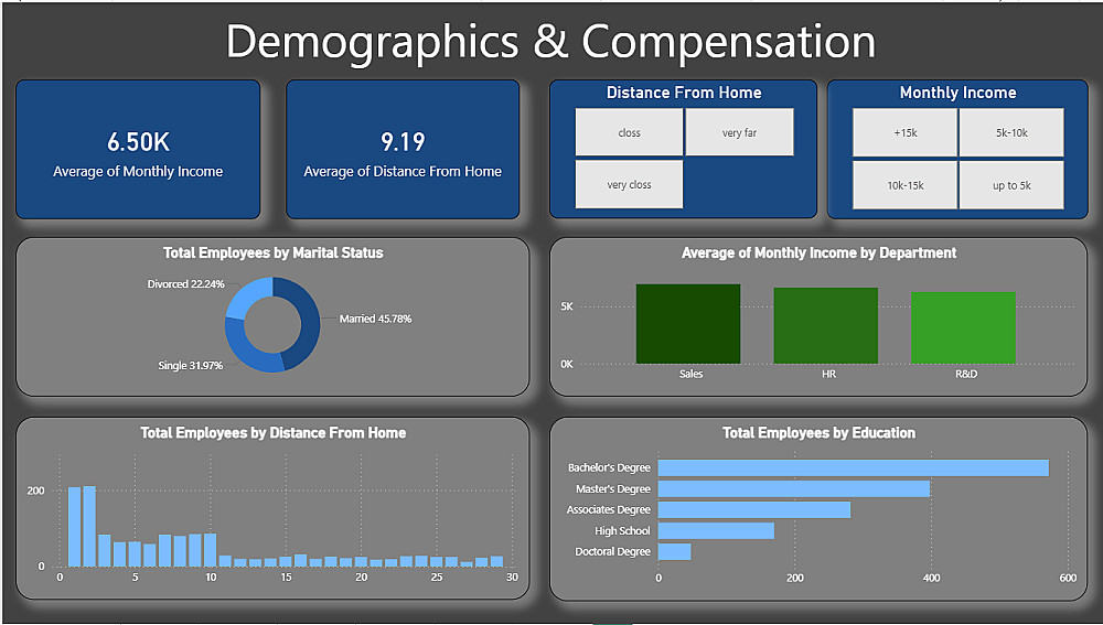 التركيبة السكانية والتعويضات (Demographics & Compensation): تحليل الرواتب ومتوسط الدخل مقارنة بالقسم، وتتبع الحالة الاجتماعية والمستوى التعليمي للموظفين.