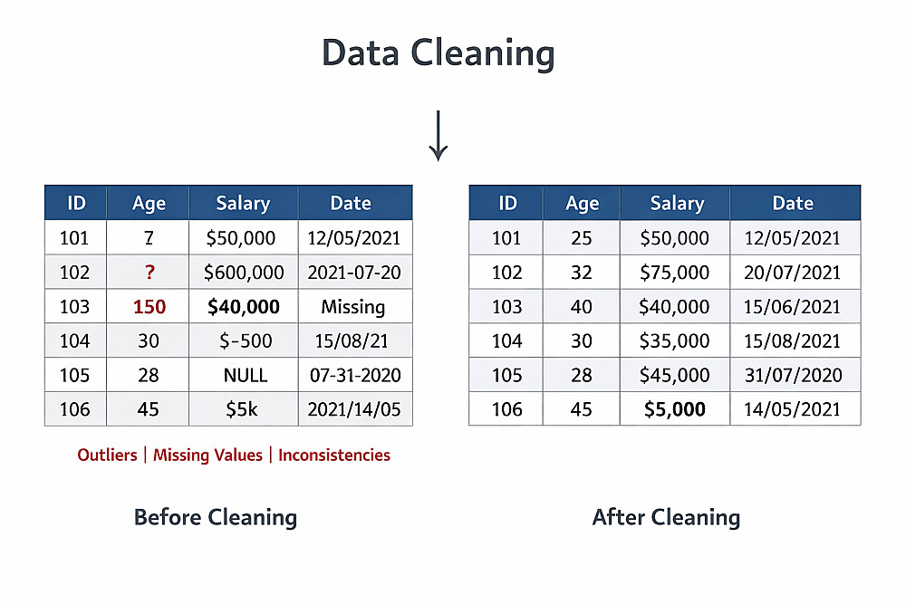 تنظيف البيانات من الأخطاء (Missing Values / Outliers).