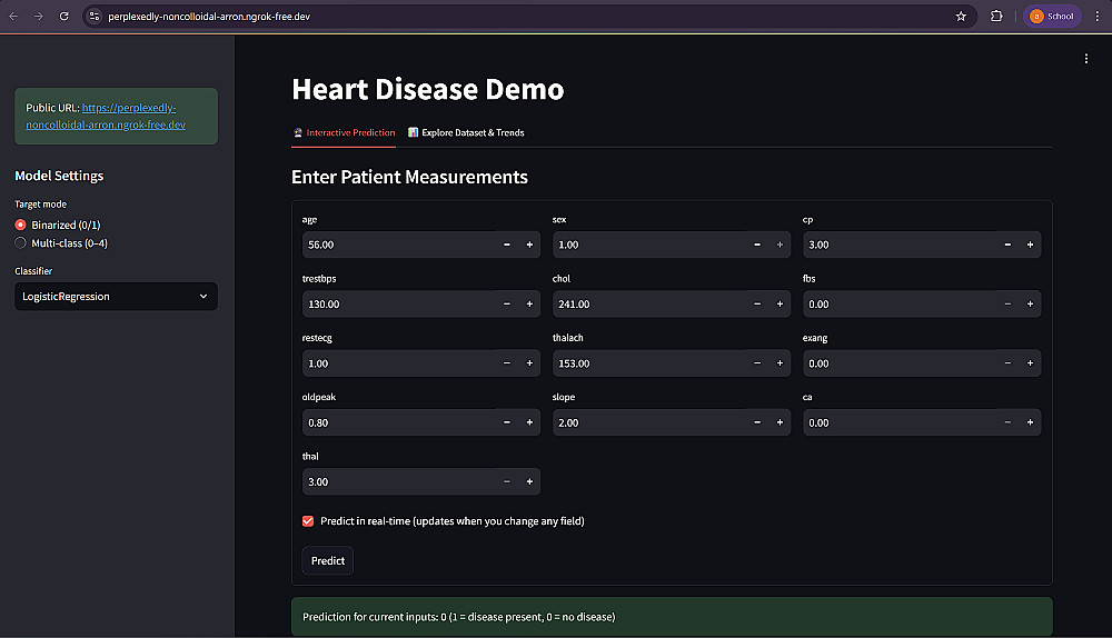 برنامج تعلم الي ييقوم بتنبؤ القلب عن طريق بيانات طبية مسجلة من طبيب. هذا البرنامج تم تطويره بpython. هذا البرنامج له مدخلات وهي قاعدة بالبيانات في صورة ملف 'csv' ومخرجات وهي الاصابة او عدم الاصابة بالمرض. البرنامج يعمل عن طريق موقع تم تطويره ب 'streamlit' وله واجهة مستخدم بسيطة وسهلة الاستخدام. الموقع يظهر اعداد المصابين بالامراض و يمكنك ايضا التغيير في البيانات الطبية على الموقع لترى تأثيرها في النتيجة الطبية للمرض.