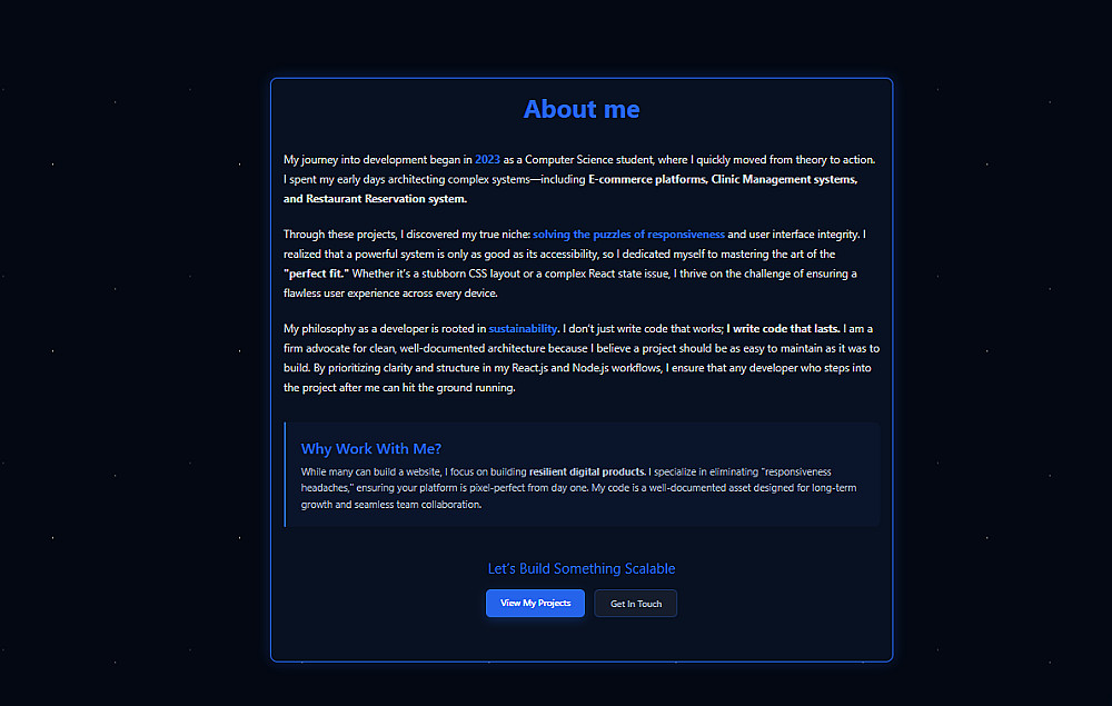 أنا هنا لتحويل رؤيتك إلى واقع رقمي ملموس. لا تتردد في مراسلتي الآن لنناقش تفاصيل مشروعك ونبدأ فوراً في بناء واجهة تليق بك!
