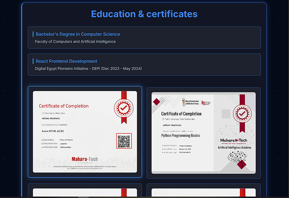 - المؤهلات والشهادات (Education): قسم مخصص لدرجاتك العلمية وكورساتك.
