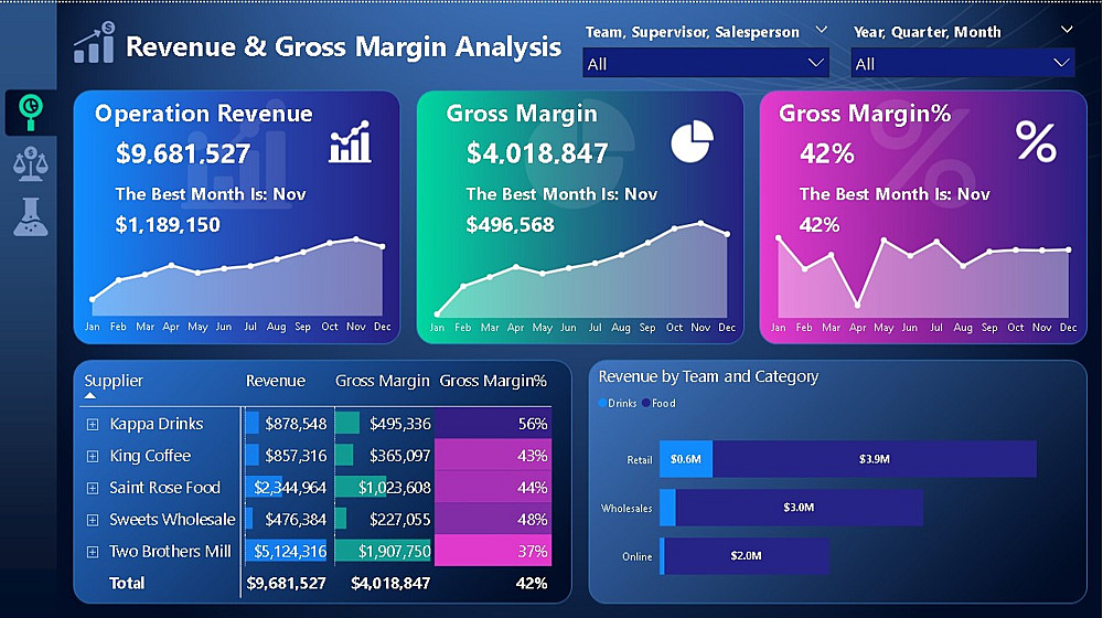 لوحة معلومات تفاعلية تعرض الإيرادات وGross Margin والمؤشرات المهمة بشكل واضح.