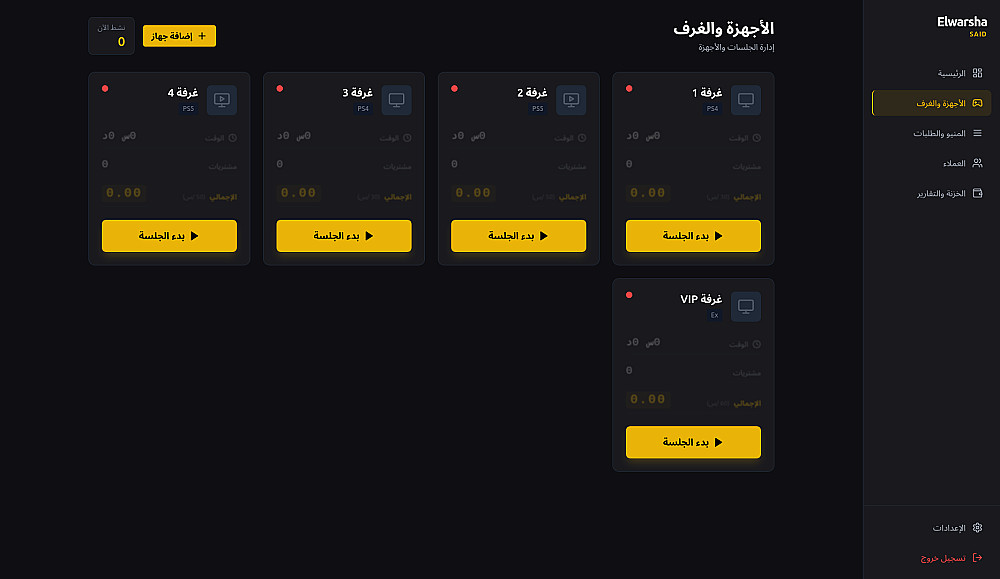 إدارة غرف البلايستيشن (PS4، PS5، VIP) مع متابعة جلسات اللعب والطلبات النشطة.