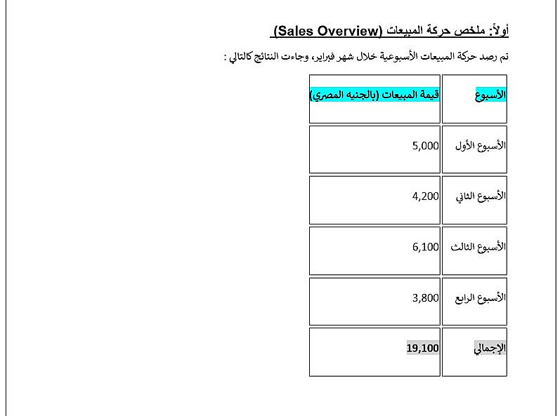 تصميم وتنسيق الجداول: إنشاء جداول احترافية وواضحة (كما في نموذج المبيعات المرفق) ودمجها مع النصوص