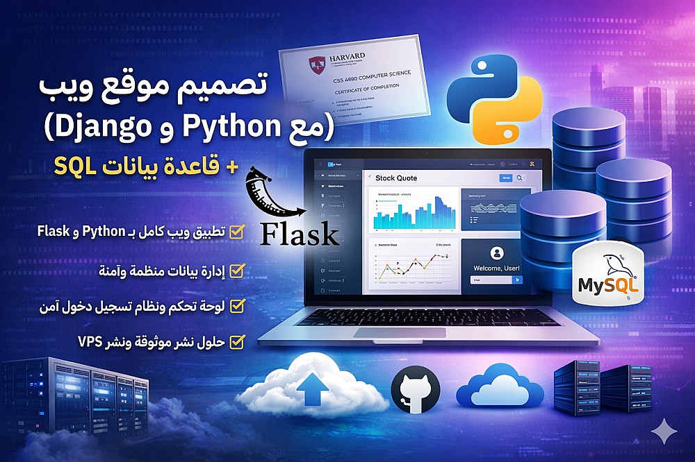 أقدم خدمة تصميم وتطوير Web Application باستخدام Python و Flask مع ربط قاعدة بيانات، اعتمادًا على الخبرة المكتسبة من دراسة كورس CS50، حيث تشمل الخدمة إنشاء موقع مكوّن من 3 إلى 5 صفحات (مثل Home و Login و Register و Dashboard و Profile) مع تصميم Frontend باستخدام HTML و CSS و JavaScript وربط الموقع بقاعدة بيانات SQLite ، بالإضافة إلى إنشاء نظام تسجيل دخول وإدارة مستخدمين، وسيتم تسليم الكود الكامل للمشروع (Source Code) بشكل منظم وجاهز للتشغيل مع شرح طريقة التشغيل خطوة بخطوة، مع إمكانية زيادة عدد الصفحات أو إضافة مميزات أخرى حسب الطلب مقابل تكلفة إضافية، كما أحرص على تقديم كود نظيف وسهل التعديل مع دعم فني بعد التسليم وإمكانية المساعدة في رفع الموقع على الإنترنت عند الطلب.