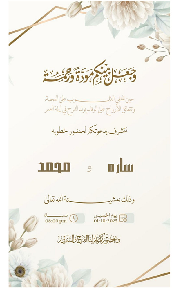 لأن اللحظات السعيدة لا تُنسى، أحب أن أشارككم فرحتكم بتصميم دعوات مميزة وفريدة. أقدم لكم خدمة تصميم دعوات (زفاف، خطوبة، أعياد ميلاد، تهنئه لأي مناسبه سعيده أو تخرج) بأسلوب احترافي يجمع بين البساطة والبهجة.