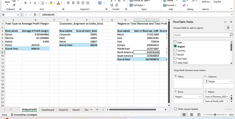 جدول يوضح العلاقة بين الإقليم وإجمالي الإيرادات وإجمالي الربح