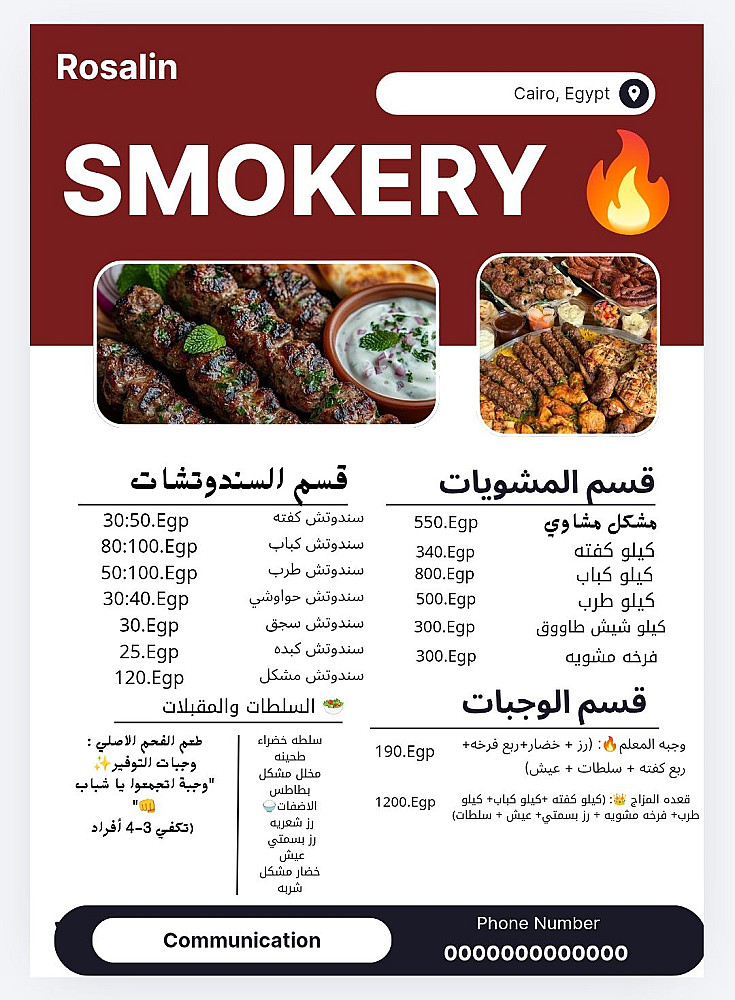 تخصيص كامل: اختيار الصور، الخلفيات، والأيقونات اللي تناسب نوع مطعمك، سواء كان مشويات، كافيه، أو وجبات سريعة.يتم تسليم التصميم بصيغة JPG أو PNG بجودة عالية، ويمكن تسليم الملف المصدر PSD عند الطلب مقابل تكلفة إضافية.