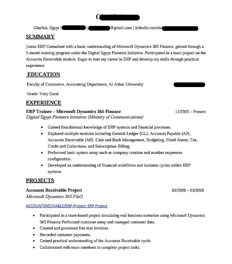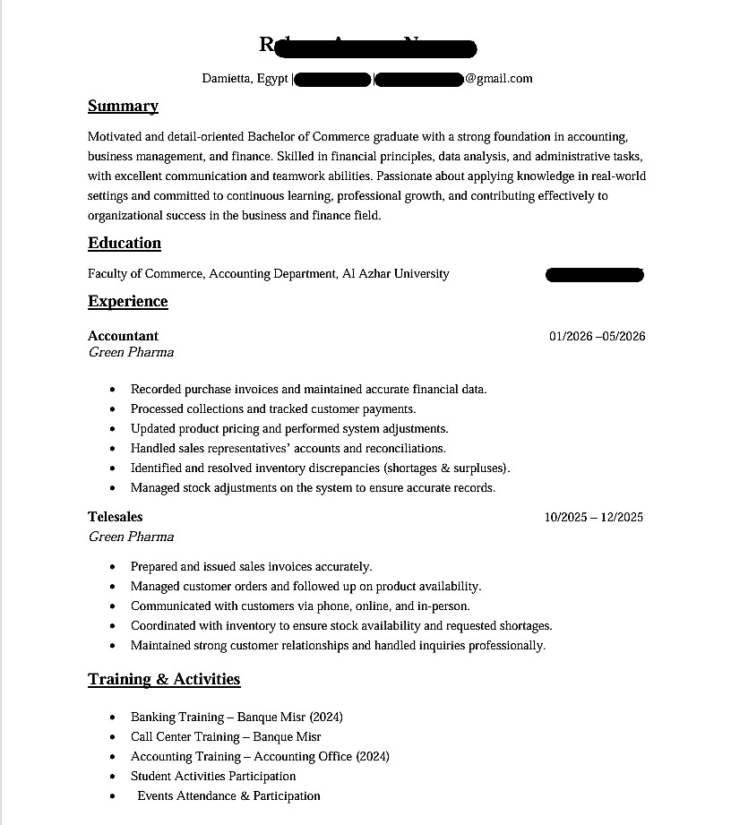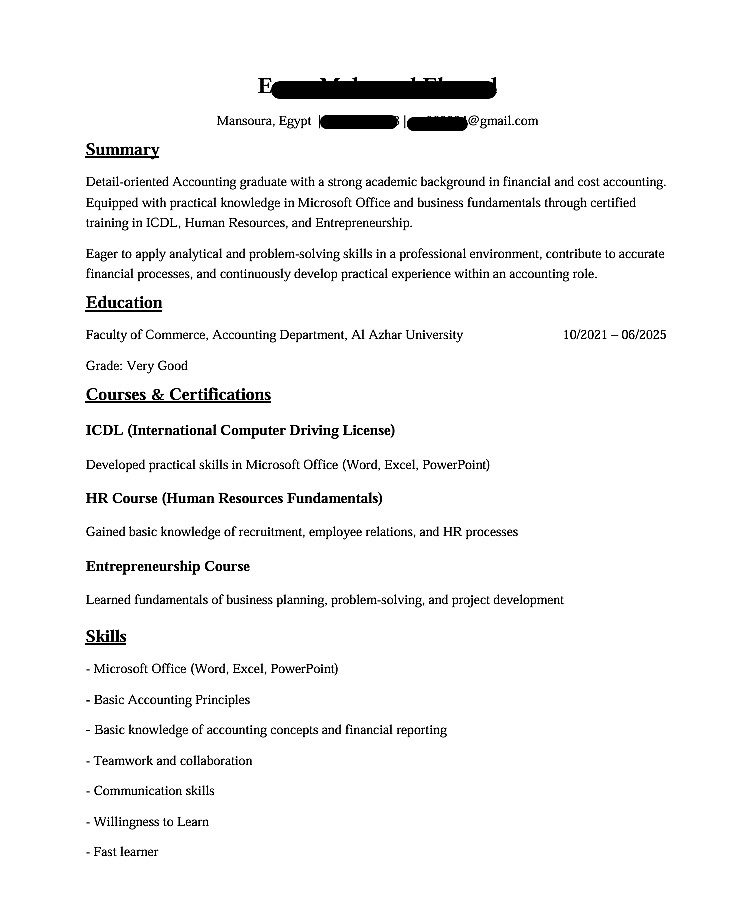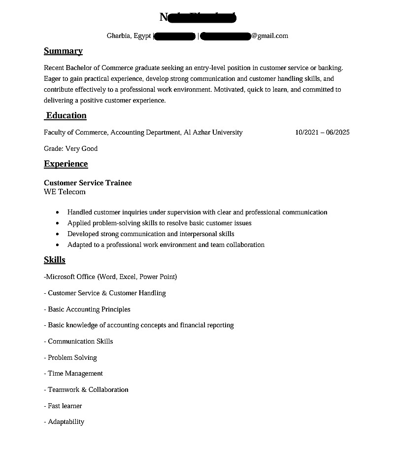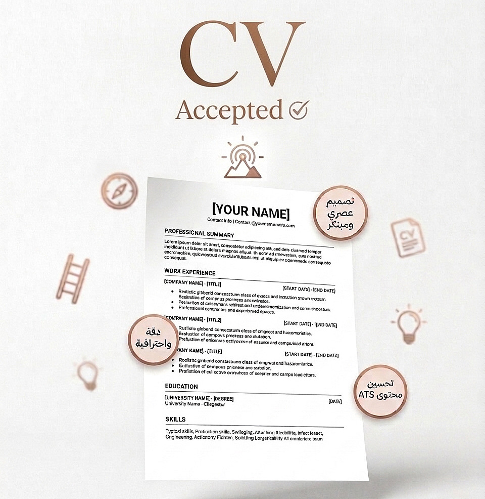 ملاحظة: الخدمة تشمل كتابة وتصميم سيرة ذاتية (من صفحة واحدة إلى صفحتين).