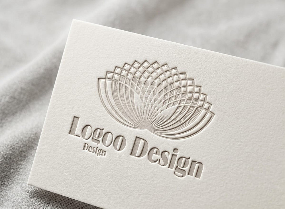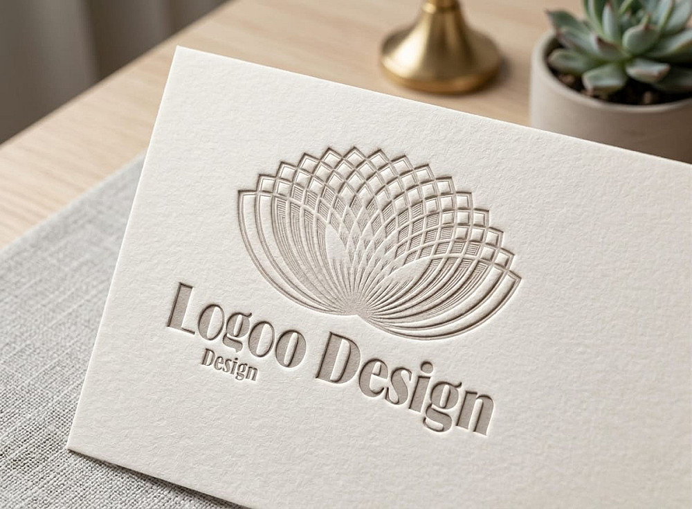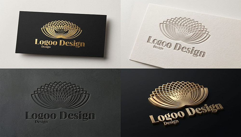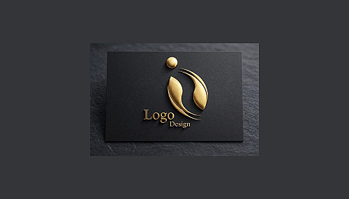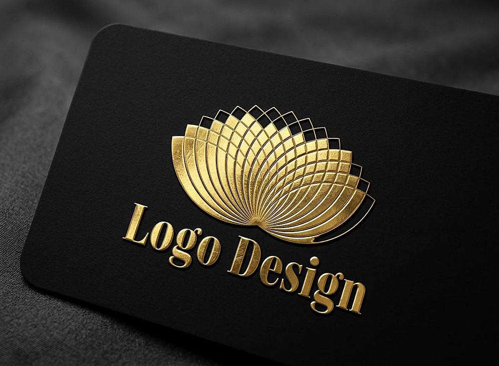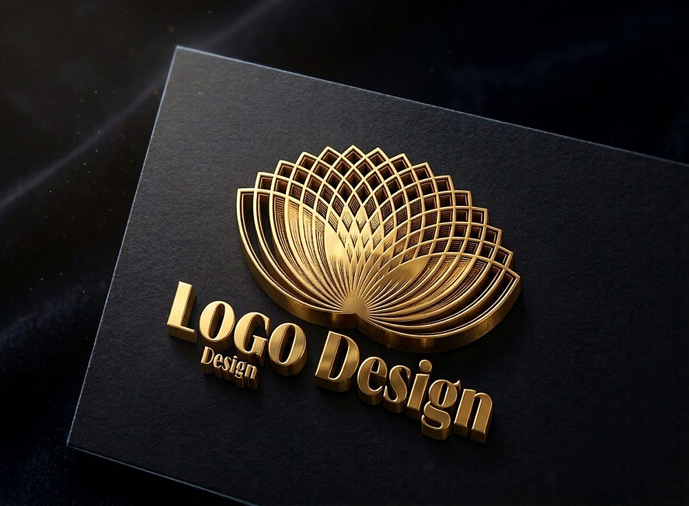 أسفل الرمز، يظهر النص "Logo Design" بخط serif كلاسيكي أنيق، محفور أو بارز بنفس التأثير الذهبي، مما يعزز الإحساس بالرقي والموثوقية.