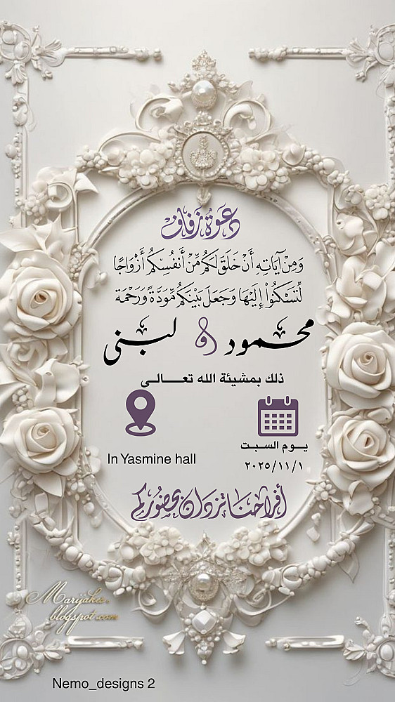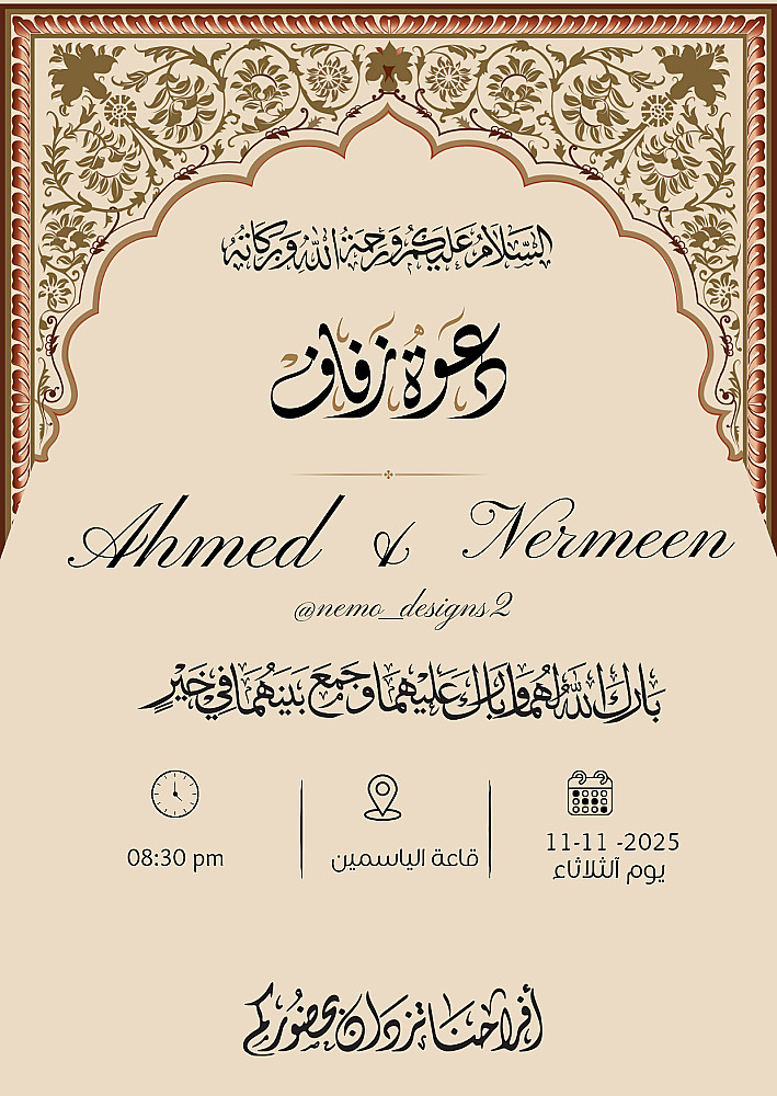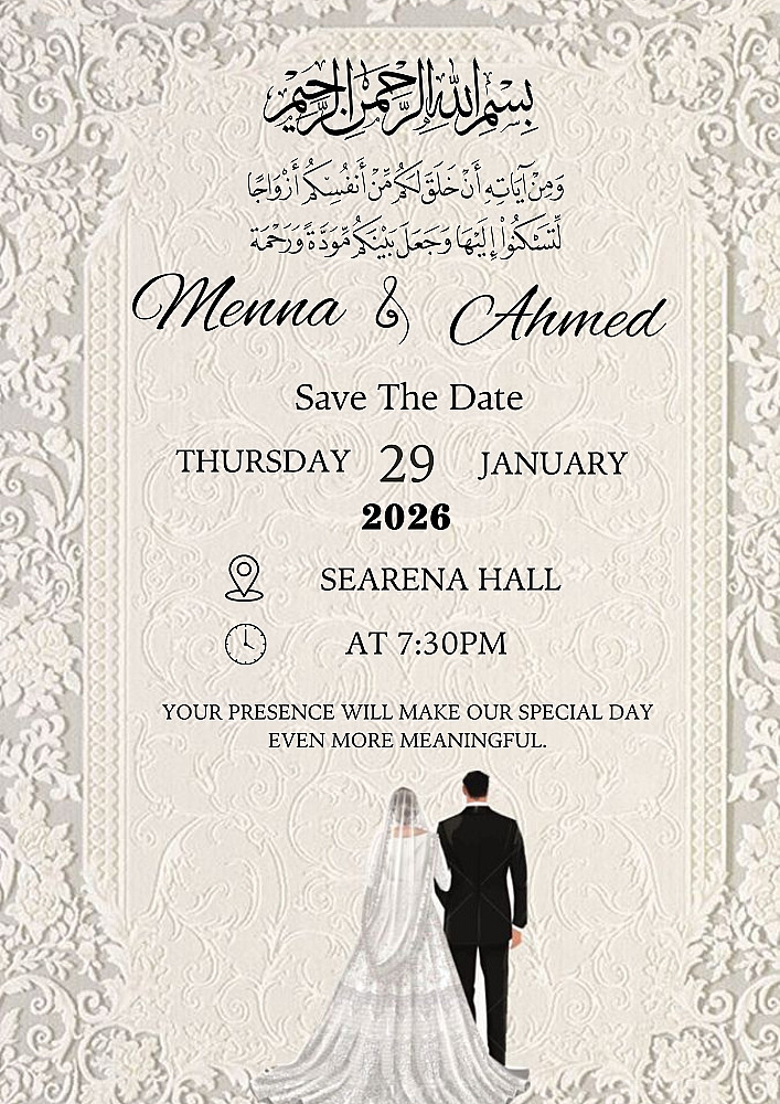 احصلي على دعوات زفاف فريدة تعكس شخصيتكم وأسلوب حفل زفافكم، بتصميم أنيق وراقي يجمع بين الجمال والوضوح. الخدمة تشمل: