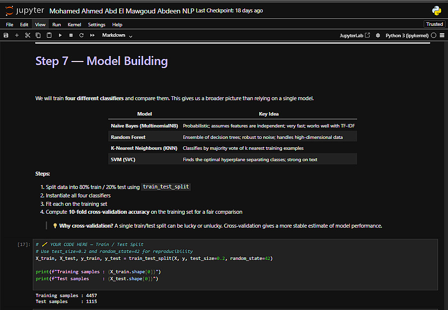 تدريب ومقارنة عدة خوارزميات تعلم آلة (مثل: SVM, Random Forest, Naive Bayes, KNN) لاختيار النموذج الأمثل لبياناتك.