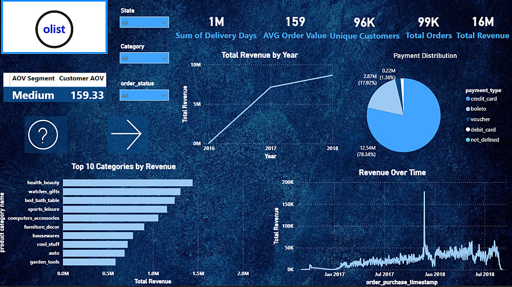 لوحة بيانات تحليلية شاملة لمتجر "Olist" للتجارة الإلكترونية. تفاصيل العمل