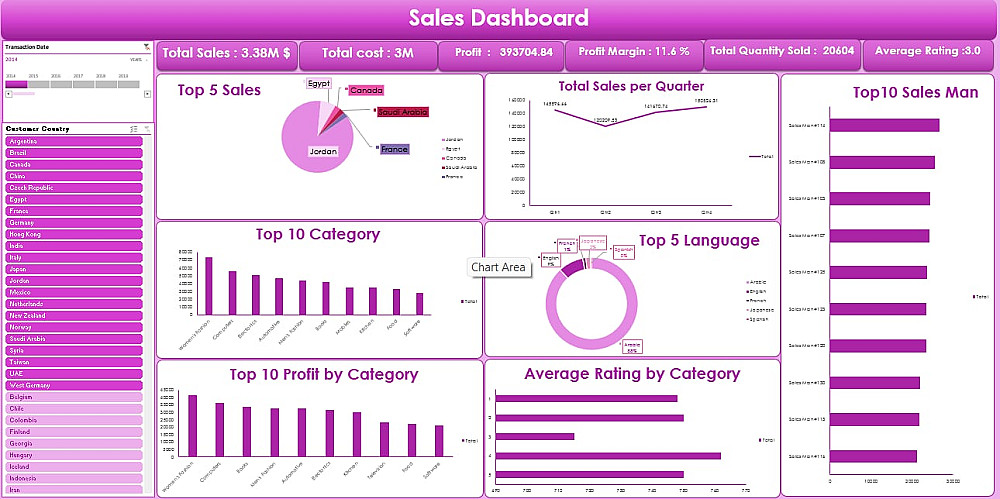 توزيع المبيعات جغرافياً باستخدام رسوم بيانية تفاعلية تبرز الدول الأعلى أداءً (مثل الأردن ومصر).