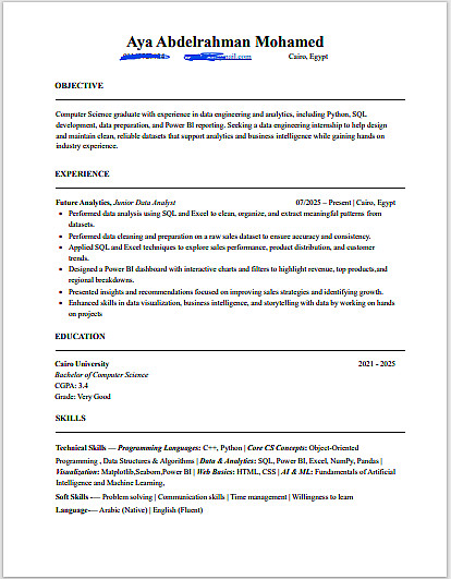 اشتغلت قبل كده على أكتر من 30 مشروع CV لعملاء في مجالات مختلفة (تقنية، إدارية، تسويق، محاسبة…)، وساعدتهم يحسنوا فرصهم في القبول بشكل واضح.