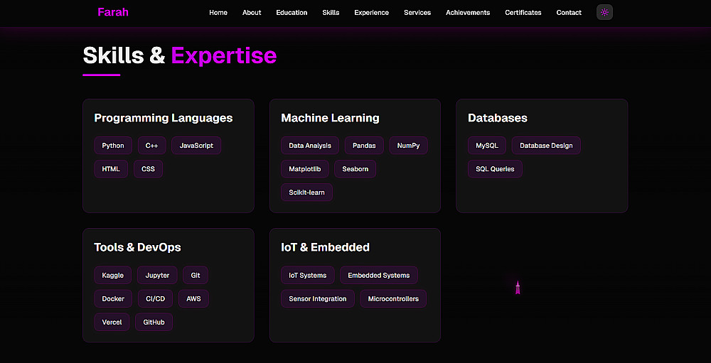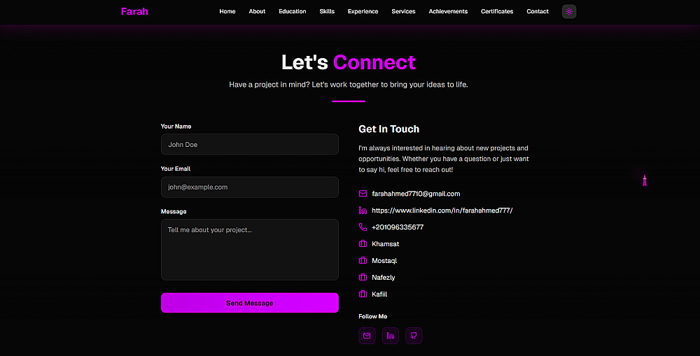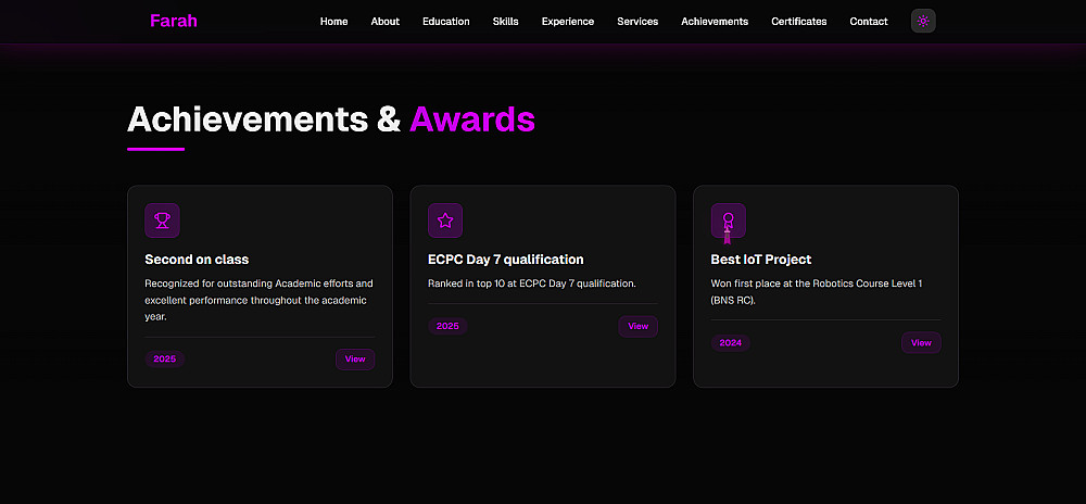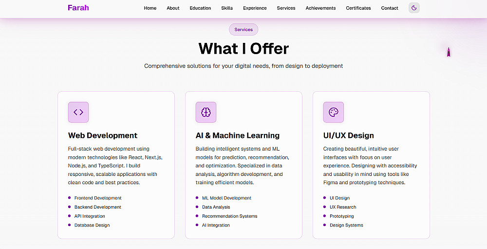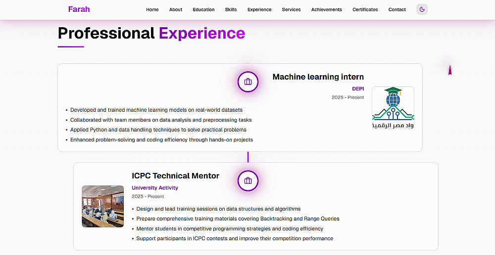 أركز في عملي على تنظيم المحتوى بشكل منطقي، وتبسيط تجربة الزائر، وعرض المشاريع بطريقة واضحة تعكس مهاراتك وأسلوبك الشخصي.