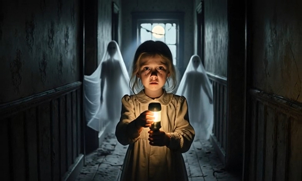 أقدم لكم مقطع فيديو أنيميشن احترافي تم تصميمه باستخدام أحدث تقنيات الذكاء الاصطناعي، يجسد مشهداً سينمائياً ساحراً لفتاة صغيرة تستكشف ممرًّا غامضاً مع أشباح لطيفة وإضاءة درامية مميزة.