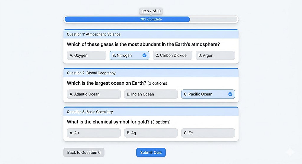 أقدم لك خدمة إنشاء تطبيق اختبارات قصيرة تفاعلي وسهل الاستخدام، مثالي للطلاب، المدرسين، أو أي شخص يريد تقييم معلوماته بسرعة.