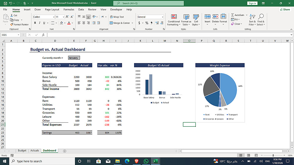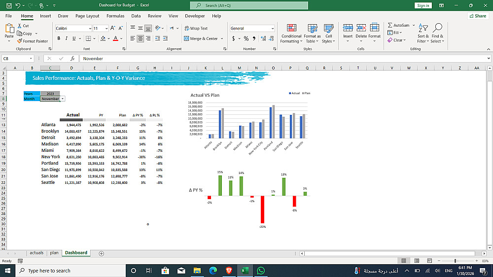إعداد Dashboard احترافي: تصميم Dashboard تفاعلي باستخدام Excel وعرض KPI بشكل واضح وسهل الفهم ومقارنة الأداء (Actual vs Budget) وتحليل الاتجاهات (Trends Analysis).