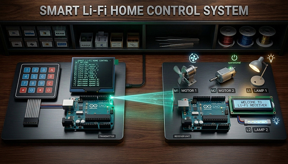 تصميم وتنفيذ نظام اتصال باستخدام تقنية Li-Fi (Light Fidelity)، وهي تقنية اتصال لاسلكي حديثة تعتمد على الضوء لنقل البيانات بدلاً من الترددات الراديوية التقليدية مثل Wi-Fi أو Bluetooth.