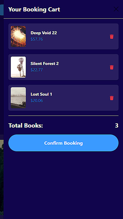 سلة حجز جانبية (Side Drawer Cart): تجربة حجز عصرية تتيح للمستخدم إضافة الروايات ومراجعتها من خلال قائمة جانبية منزلقة، مع حفظ البيانات في الـ Local Storage.