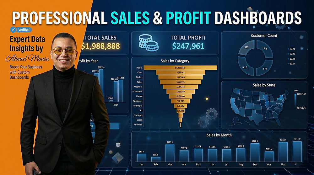 بصفتي متخصصاً في تحليل البيانات سأحول أرقامك إلى لوحة تحكم (Dashboard) تفاعلية وذكية وجذابة بصريا تساعدك على مراقبة نشاطك التجاري بلمحة عين