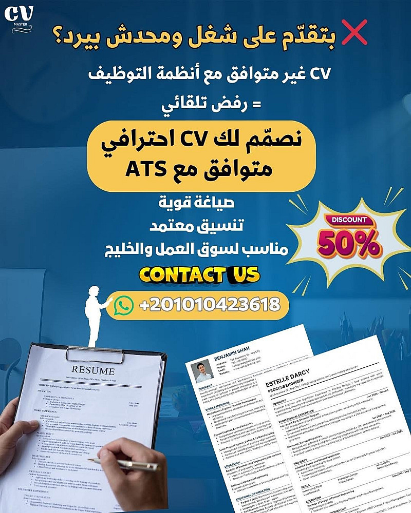 أقدم خدمة احترافية في كتابة وتصميم السيرة الذاتية (CV) بشكل متوافق مع أنظمة التوظيف (ATS) لمساعدتك في الحصول على فرص عمل أفضل وزيادة نسبة قبولك لدى الشركات.