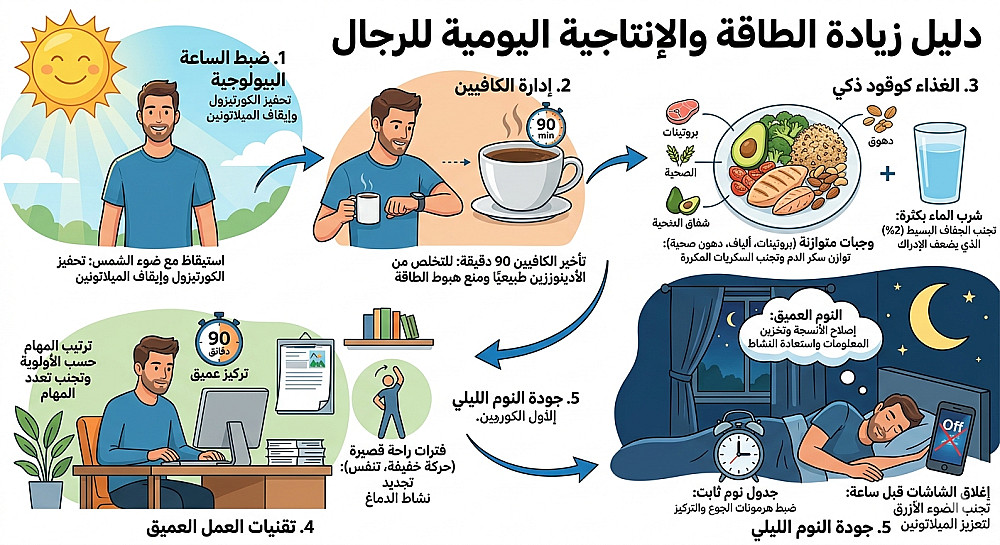 تعتمد زيادة مستويات الطاقة والإنتاجية اليومية بشكل أساسي على تنظيم الساعة البيولوجية للجسم، ويبدأ ذلك من لحظة الاستيقاظ عبر التعرض لضوء الشمس الطبيعي الذي يحفز إفراز الكورتيزول ويوقف ميلاتونين النوم، مع ضرورة تأخير تناول الكافيين لمدة 90 دقيقة على الأقل للسماح للجسم بالتخلص من الأدينوزين المتراكم طبيعيًا، مما يمنع حدوث هبوط الطاقة المفاجئ في منتصف النهار ويضمن استمرارية التركيز الذهني لفترات أطول دون الحاجة لمنبهات مستمرة.