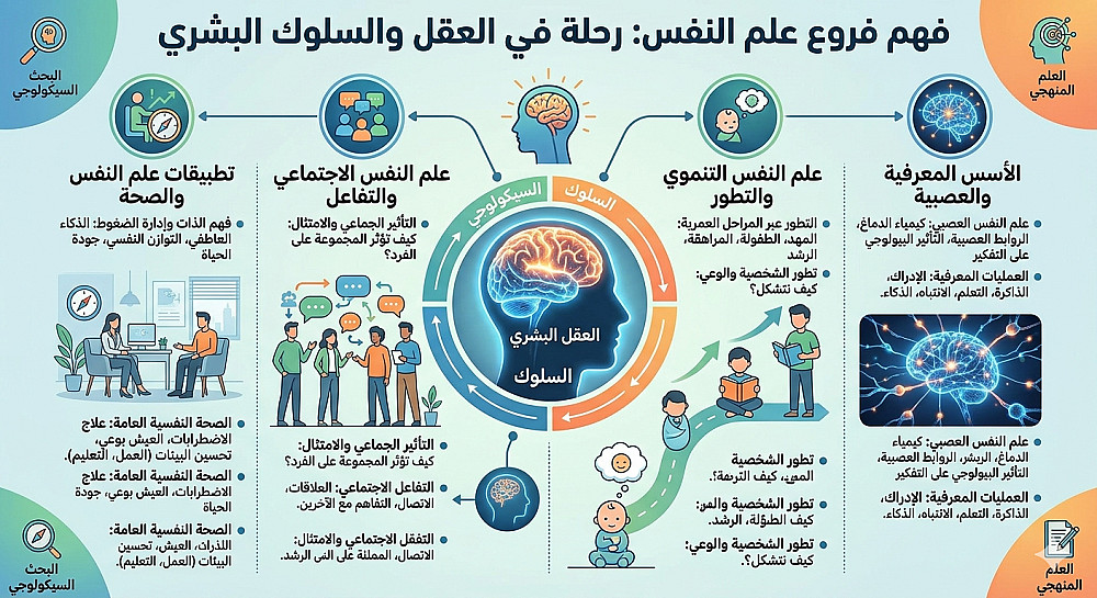 يُعد علم النفس (Psychology) من أكثر العلوم إثارة للشغف، فهو الجسر الرابط بين السلوك الظاهري والعمليات العقلية المعقدة التي تجري في الخفاء. لا يقتصر هذا العلم على تحليل الاضطرابات النفسية أو تقديم الجلسات العلاجية كما هو شائع في السينما، بل هو دراسة منهجية وعلمية شاملة تبحث في كيفية إدراك الإنسان للعالم من حوله، وكيفية تشكّل شخصيته، ودوافع أفعاله وتفاعلاته الاجتماعية. تعود جذور هذا العلم إلى التساؤلات الفلسفية القديمة حول "الروح" و"الوعي"، لكنه استقل كعلم تجريبي في القرن التاسع عشر، ليتفرع اليوم إلى مجالات مذهلة تشمل علم النفس العصبي الذي يدرس كيمياء الدماغ، وعلم النفس التنموي الذي يراقب تطورنا من المهد إلى اللحد، وعلم النفس الاجتماعي الذي يفكك شيفرات التأثير الجماعي والامتثال.تكمن أهمية علم النفس في قدرته على منحنا أدوات "لفهم الذات" أولاً؛ فعندما نستوعب آليات الذاكرة، والتعلم، والذكاء العاطفي، نصبح أكثر قدرة على إدارة ضغوط الحياة وتحقيق التوازن النفسي. كما يلعب دوراً محورياً في تطوير المجتمعات، من خلال تحسين بيئات العمل، وتطوير المناهج التعليمية لتناسب الفروق الفردية بين الطلاب، وصولاً إلى تعزيز الصحة العامة عبر تغيير السلوكيات الضارة. إن كل قرار نتخذه، وكل عاطفة نشعر بها، وكل ذكرى نستعيدها هي في جوهرها موضوع للبحث السيكولوجي. وفي عصرنا الحديث المليء بالمتغيرات المتسارعة، تبرز الحاجة إلى علم النفس أكثر من أي وقت مضى لفك التباسات النفس البشرية، ومعالجة قضايا القلق والاكتئاب الناتجة عن العزلة الرقمية، مما يجعله ليس مجرد تخصص أكاديمي، بل هو فن وعلم "العيش بوعي". باختصار، علم النفس هو المرآة التي تعكس لنا حقيقة ما نحن عليه، والبوصلة التي توجهنا نحو فهم أعمق للآخرين وللعالم، مما يساهم في بناء حياة أكثر جودة وتواصلاً إنسانياً.