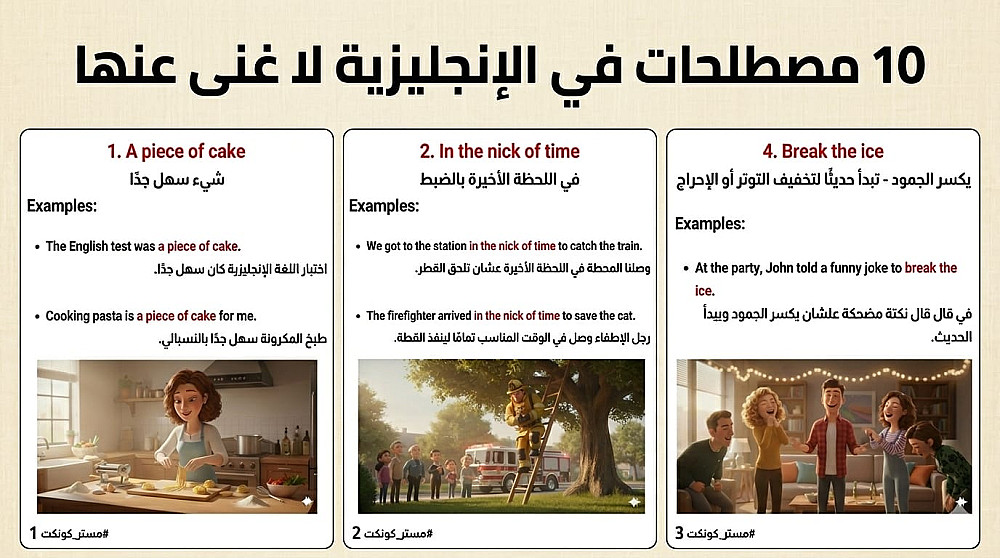 ✅ قاموس المصطلحات (10 Idioms): ملف إضافي يشرح أهم 10 مصطلحات يستخدمها الأجانب في حياتهم اليومية، مع شرح كيفية استخدامها لتبدو مثل المتحدثين الأصليين.